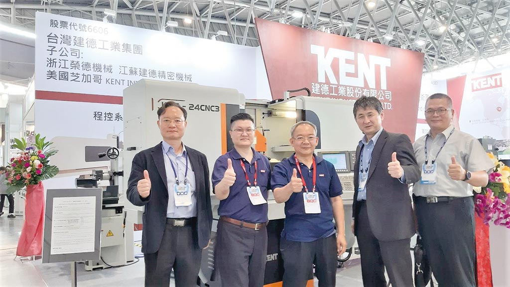 展示第一天,臺灣發那科董事長山田雄策(右二)特別率隊至建德工業攤位拜訪,受到建德董事長李金旆(右三)的熱情接待,未來雙方並將深化技術合作,共同開發符合客戶需求的產品。圖/黃全興